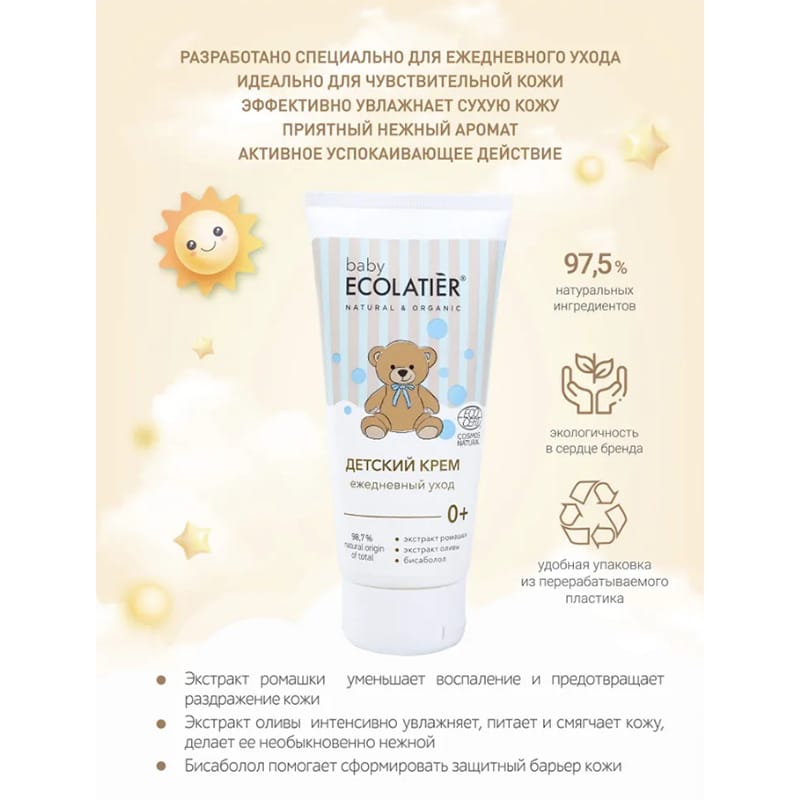 Детский крем разработан специально для ежедневного ухода за чувствительной кожей малышей с рождения. Эффективно увлажняет сухую кожу, помогает избавиться от раздражений и шелушения, защищает кожу. Чистая натуральная формула разработана для минимизации риска аллергических реакций, не содержит ингредиенты, о которых стоит беспокоится.