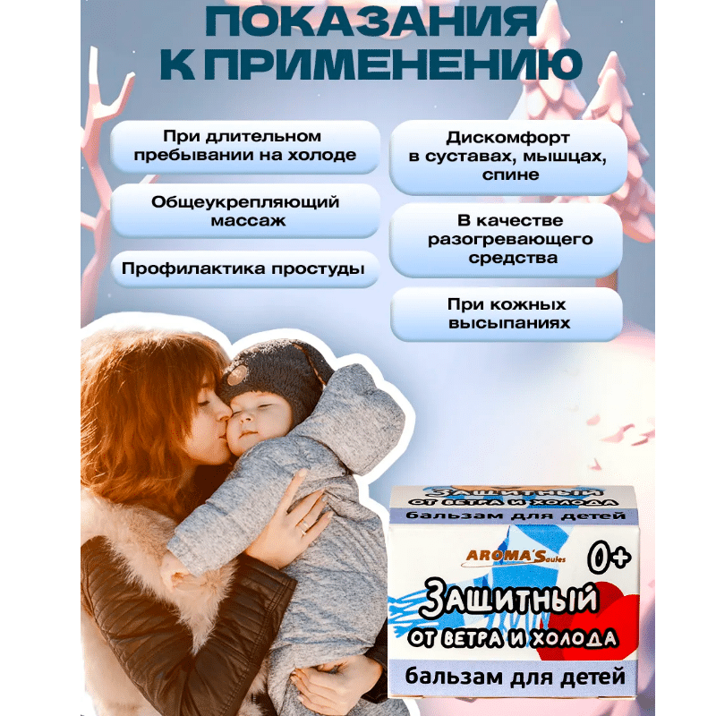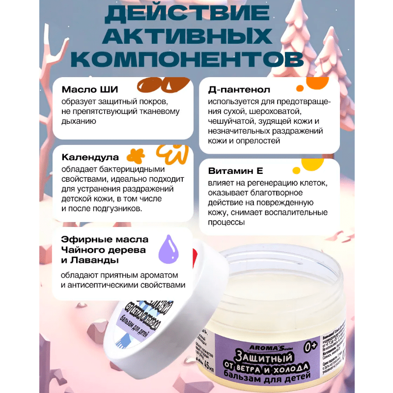 Бальзам для детей Защитный от ветра и холода 0+ — разработан для защиты нежной кожи ребенка от погодных воздействий. Может применяться для взрослых с чувствительной кожей. Он обеспечивает особо надежную защиту в ненастье, а также защищает кожу от потери влаги, хорошо впитывается и оставляет на коже тонкий слой жира, который может служить дополнительной защитой Вашему малышу.