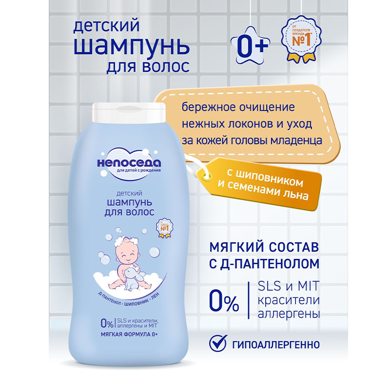 Мягкий шампунь с шиповником Непоседа создан специально для ухода за первыми локонами и нежной кожей головы новорожденных.