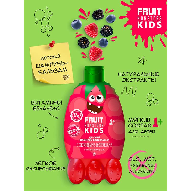 Шампунь-бальзам 2 в 1 детский Фрутомонстры Mega monsters Малина