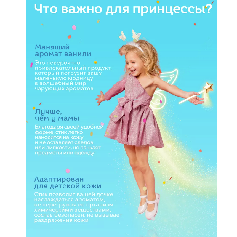 Стильный флакончик таит в себе манящий аромат цвета ванили – секрет особого очарования Принцессы. Стик легко наносится, не оставляет следов и липкости, не пачкает предметы и одежду. Манящий аромат и стильный флакон – как у мамы, только лучше.