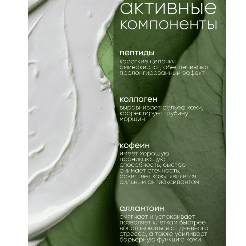 Крем вокруг глаз с содержанием аллантоина, кофеина, коллагена и комплексом пептидов помогает справиться с отечностью, тонизирует и обновляет клетки кожи, наполняя ее сиянием.