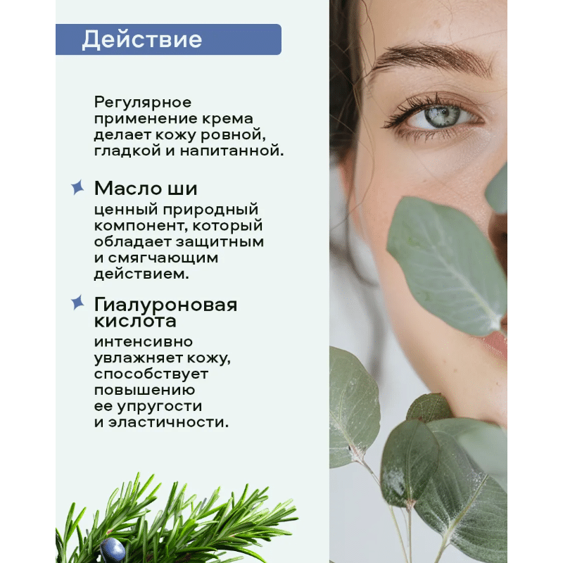 Деионизированная вода, цветочная вода розмарина, масло ши, масло какао, масло подсолнечника, глицерилмоностеарат, воск авокадо, экстракт череды, экстракт мать-и-мачехи, гиалуроновая кислота (высоко-и низкомолекулярная), экстракт петрушки, аллантоин, д-пантенол (провитамин B5), гель алоэ вера, растительный глицерин, янтарная кислота, токоферол (витамин E), эфирное масло кедра атласского, можжевельника и апельсина, сорбиновая кислота, молочная кислота, сорбат калия, цитрат серебра.