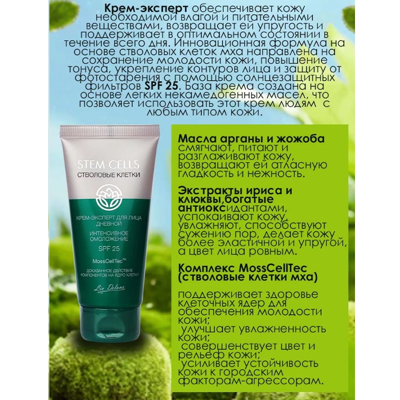 Крем-эксперт обеспечивает кожу необходимой влагой и питательными веществами, возвращает ей упругость и поддерживает в оптимальном состоянии в течение всего дня. Инновационная формула на основе стволовых клеток мха направлена на сохранение молодости кожи, повышение тонуса, укрепление контуров лица и защиту от фотостарения с помощью солнцезащитных фильтров SPF 25. База крема создана на основе легких некамедогенных масел, что позволяет использовать этот крем людям с любым типом кожи.