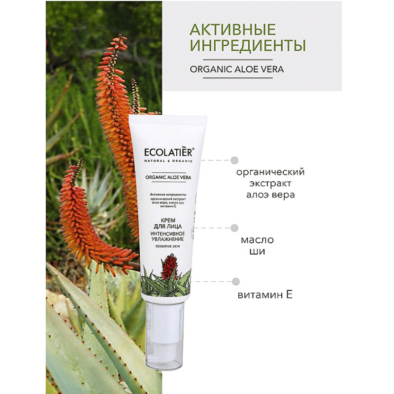 Крем для лица ECOLATIER® Organic Aloe Vera интенсивно насыщает влагой сухую обезвоженную кожу, восстанавливает гидро-липидный баланс, дарит комфорт на весь день.