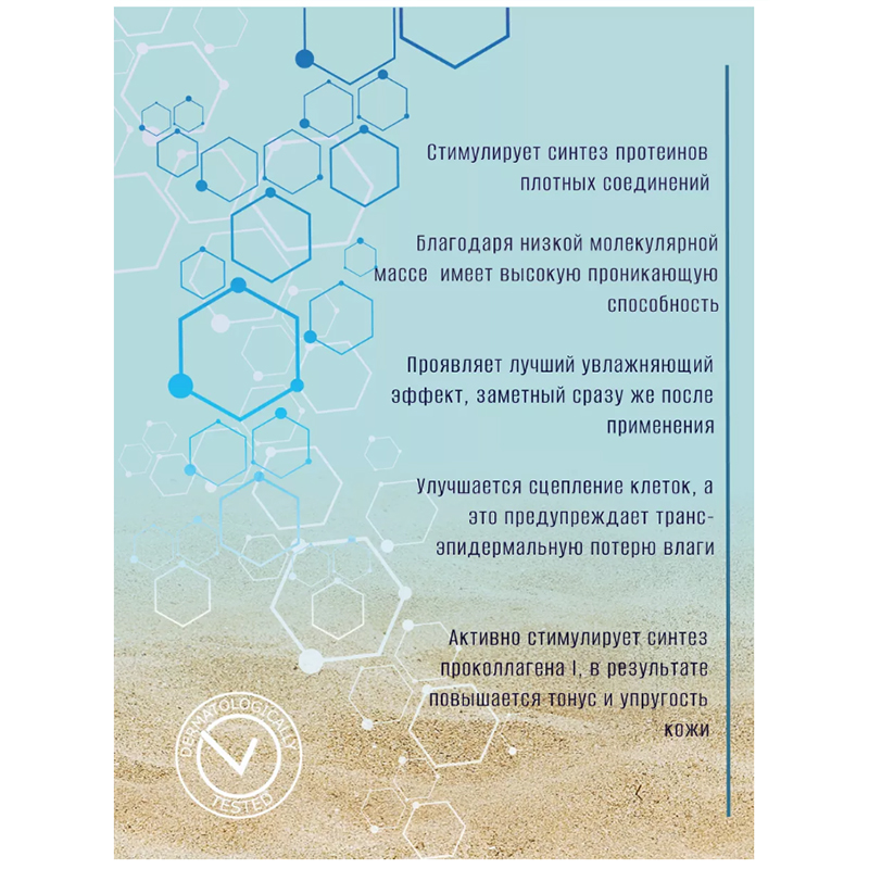 Гиалуроновая кислота благодаря низкой молекулярной массе имеет высокую проникающую способность, а потому проявляет лучший увлажняющий эффект, заметный сразу же после применения. Стимулирует синтез протеинов плотных соединений, в результате улучшается сцепление клеток, а это предупреждает транс-эпидермальную потерю влаги. Активно стимулирует синтез проколлагена I, в результате повышается тонус и упругость кожи.