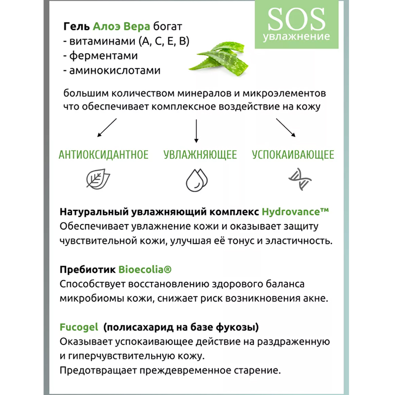 Гель Алоэ Вера богат витаминами (A, C, E, B), ферментами, аминокислотами и большим количеством минералов и микроэлементов, что обеспечивает его комплексное воздействие на кожу: антиоксидантное, увлажняющее, успокаивающее.