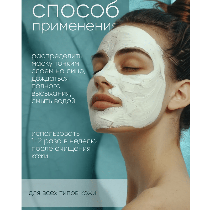 Применение : Распределить маску тонким слоем на лицо, дождаться полного высыхания, смыть водой.