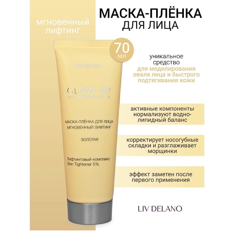 Золотая маска-пленка – уникальное средство для моделирования овала лица и быстрого подтягивания кожи. Эффект заметен после первого применения. Активные компоненты позволяют нормализовать водно-липидный баланс, скорректировать носогубные складки и разгладить морщинки. Продукт обладает накопительным действием. Средство показано для всех типов кожи.