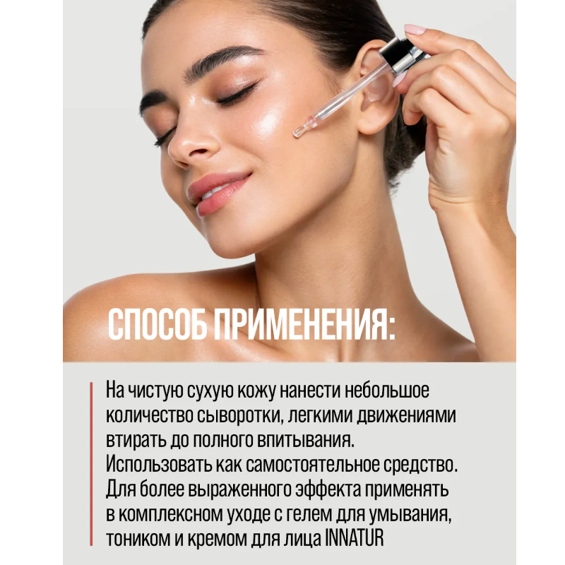 Способ применения: На чистую сухую кожу нанести небольшое количество сыворотки, легкими движениями втирать до полного впитывания. Использовать как самостоятельное средство. Для более выраженного эффекта применять в комплексном уходе с гелем для умывания, тоником и кремом для лица INNATURE.