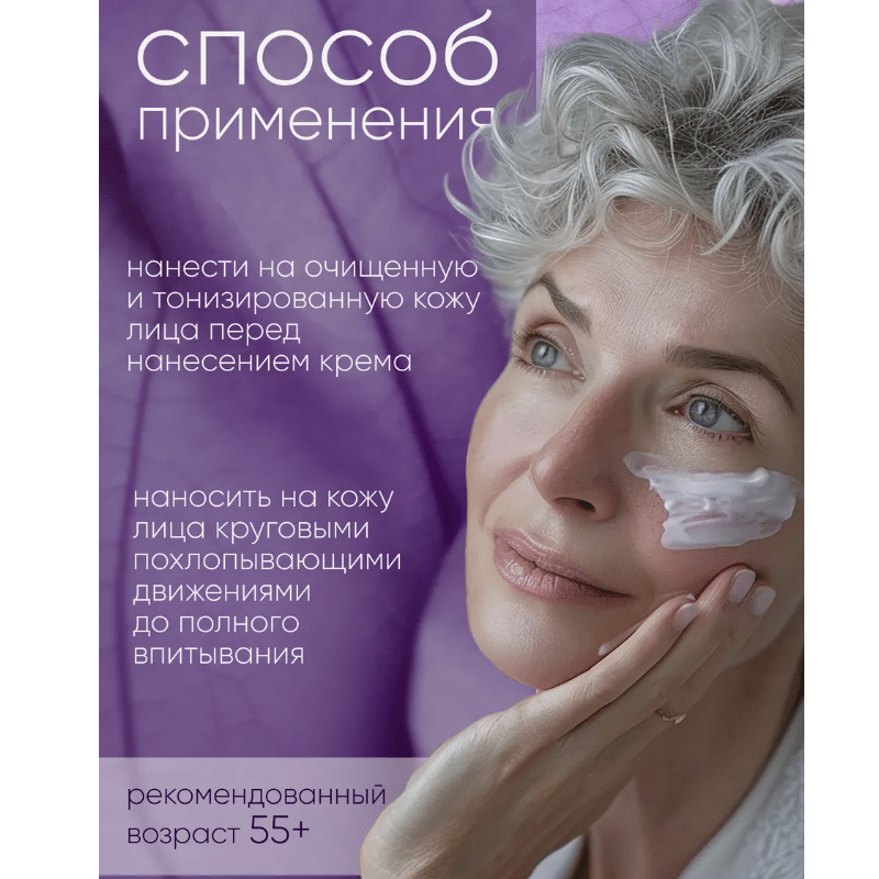 | Назначение | Антивозрастной уход, Смягчают и сокращают морщины, Снижение возрастной пигментации, Сужение пор, Увлажнение |