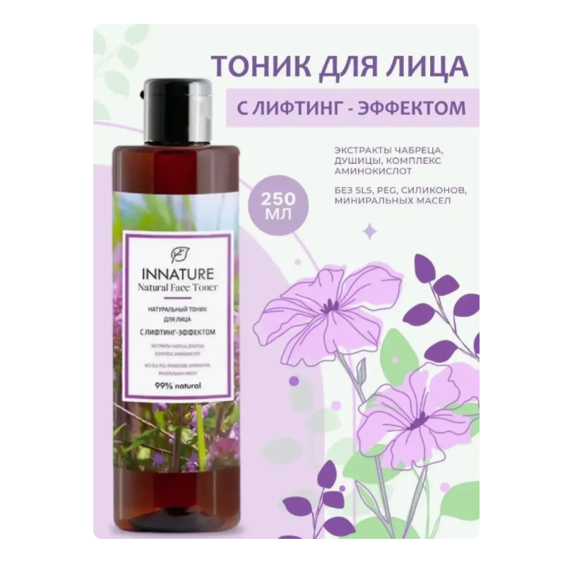 Натуральный тоник для лица с лифтинг-эффектом бережно очищает и тонизирует кожу, предупреждает появление возрастных пигментных пятен, снимает отечность и оздоравливает кожу.