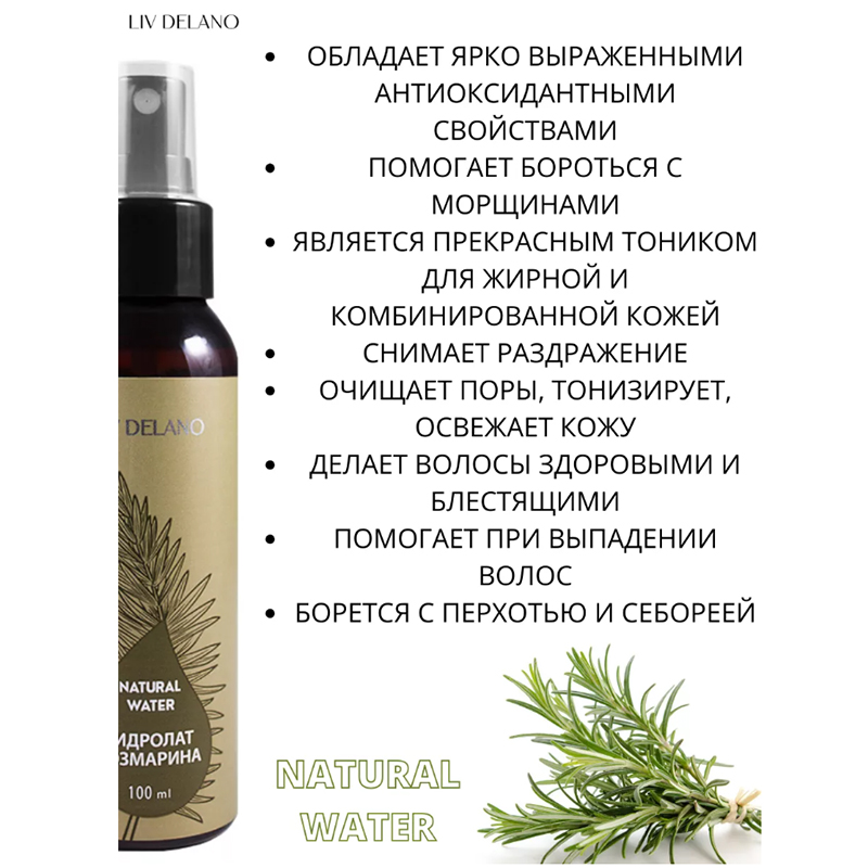 Гидролат розмарина глубоко увлажняет и тонизирует, освежает и балансирует кожу лица, снижает жирный блеск, матирует, нормализуя выделения себума, сужает поры. Подходит для ухода за жирной и комбинированной кожей. Благодаря антиоксидантным свойствам помогает в борьбе с возрастными изменениями. Розмариновая вода полезна и для других участков кожи лица и тела, как природный тоник и чудесный увлажнитель!