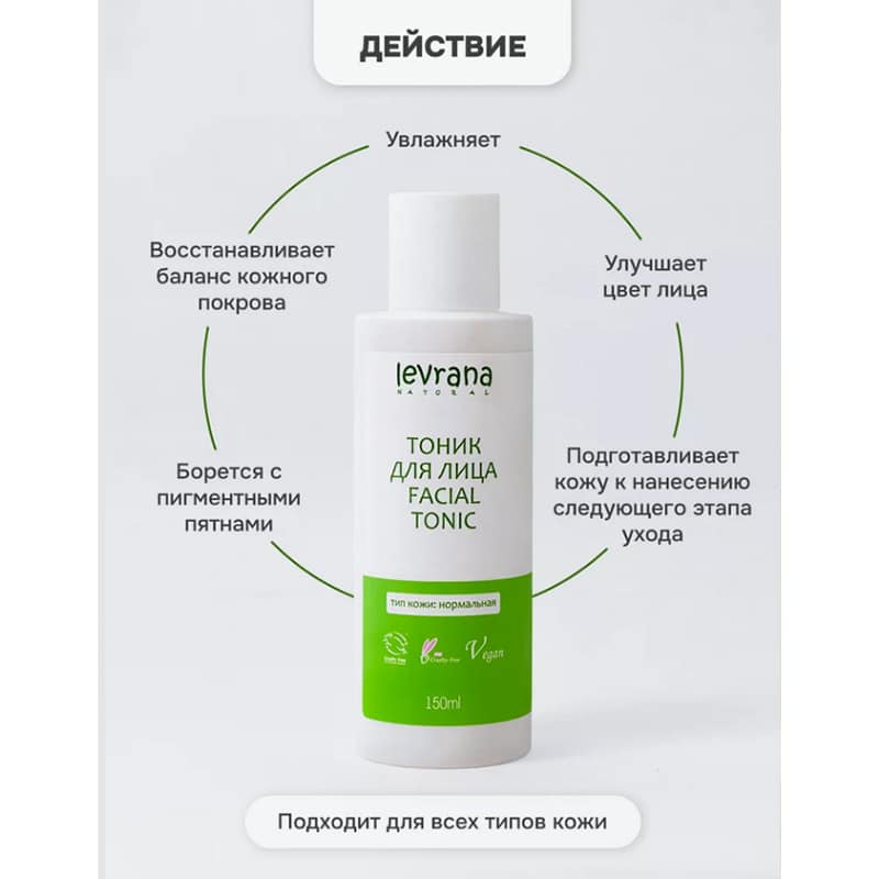 Создан для нормальной кожи, сохраняет естественный баланс. Тоники от Levrana — это уход, а не очищение! Тоник применяется после очищения лица для балансирования общего состояния кожи, перед нанесением сыворотки и крема. В составе тоника органический сок алоэ вера, который обладает смягчающим, успокаивающим, тонизирующим и увлажняющим действием, а также экстракты клюквы и элеутерококка.