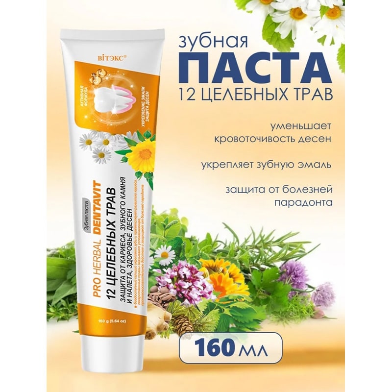 Зубная паста 12 ЦЕЛЕБНЫХ ТРАВ Здоровье десен и защита от кариеса, зубного камня и налета Dentavit