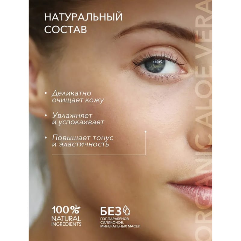Соответствует требованиям Vegan Society (Великобритания). Сертифицированные органические ингредиенты: Сок органического алоэ вера содержит витамины, аминокислоты, минералы, полисахариды, фитонциды, обладает высокой био доступностью и является природным стимулятором регенерации клеток и тканей, обеспечивает глубокое увлажнение, успокаивает кожу, делает ее нежной, мягкой и ухоженной.