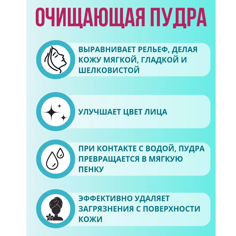 Очищающая пудра эффективно устраняет загрязнения с поверхности кожи, улучшает цвет лица, выравнивает рельеф, делая кожу гладкой, нежной и мягкой. При соединении с водой очищающая пудра превращается в мягкую, легкую пену.