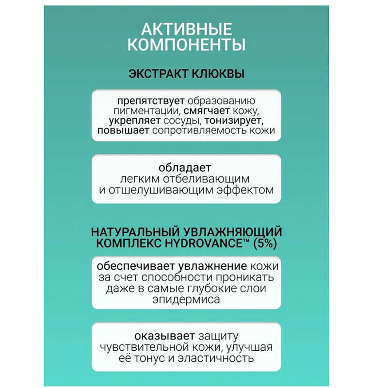 Увлажняющий тонер является незаменимым средством для сохранения оптимального уровня увлажненности кожи после ее очищения. Средство, нанесенное сразу же после умывания, помогает избежать появления сухости, шелушений, чувства стянутости. Благодаря гелеобразной лёгкой текстуре тонер превосходно абсорбируется кожей, моментально увлажняя и освежая ее.Экстракт клюквы препятствует образованию пигментации, смягчает кожу, укрепляет сосуды, тонизирует, повышает сопротивляемость кожи. Обладает легким отбеливающим и отшелушивающим эффектом.Натуральный увлажняющий комплекс Hydrovance™ обеспечивает увлажнение кожи за счет способности проникать даже в самые глубокие слои эпидермиса. Оказывает защиту чувствительной кожи, улучшая её тонус и эластичность.