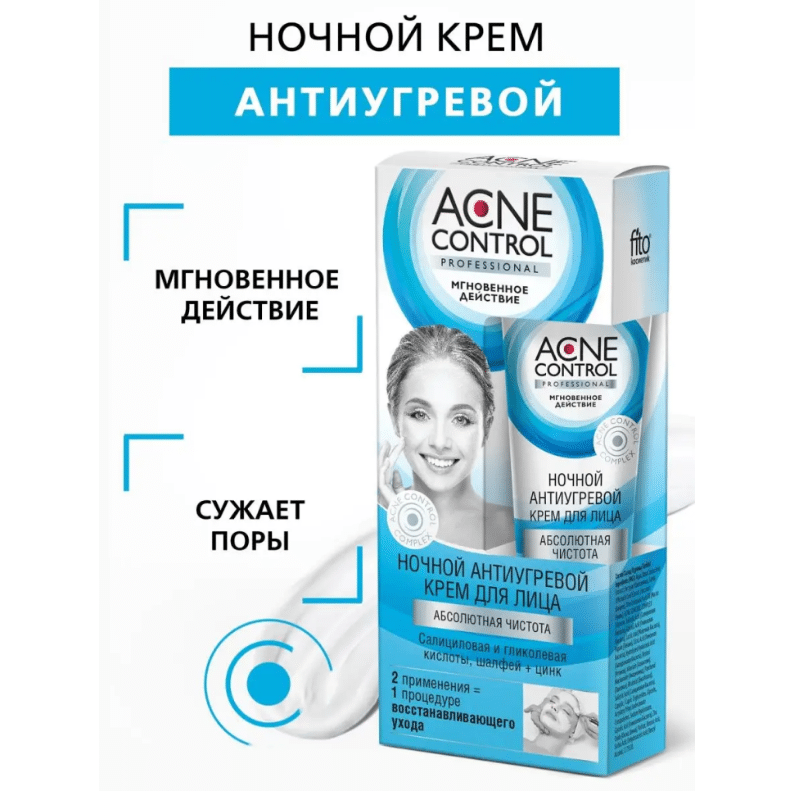 Ночной крем для лица быстро и эффективно устраняет прыщи, угри, уменьшает выделение кожного сала, разглаживает кожу и стирает следы постакне. Инновационный ACNE CONTROL COMPLEXТМ мгновенно избавляет от акне, сужает поры, наполняет клетки кожи ценными витаминами, минералами и микроэлементами, повышает защитные свойства, способствует омоложению кожи. Комбинирование салициловой и гликолевой кислот, входящих в состав крема, помогает добиться качественных результатов при лечении акне. Цинк обладает подсушивающим действием, снимает покраснение и зуд. Натуральный экстракт шалфея дезинфицирует кожу, увлажняет, питает, тонизирует, стимулирует регенерацию клеток кожи, выравнивает структуру и тон лица.