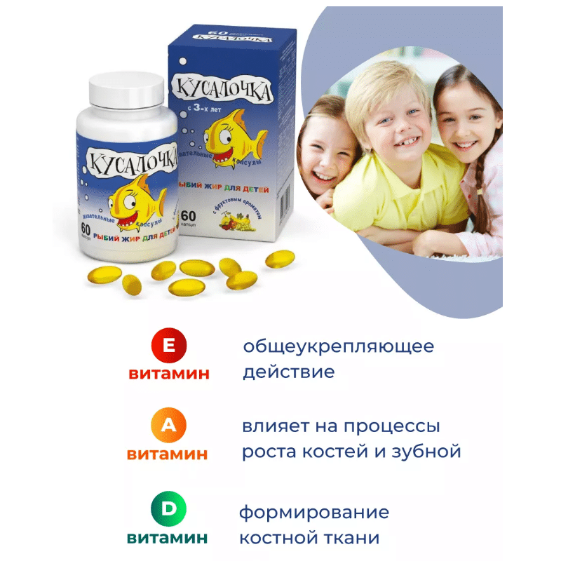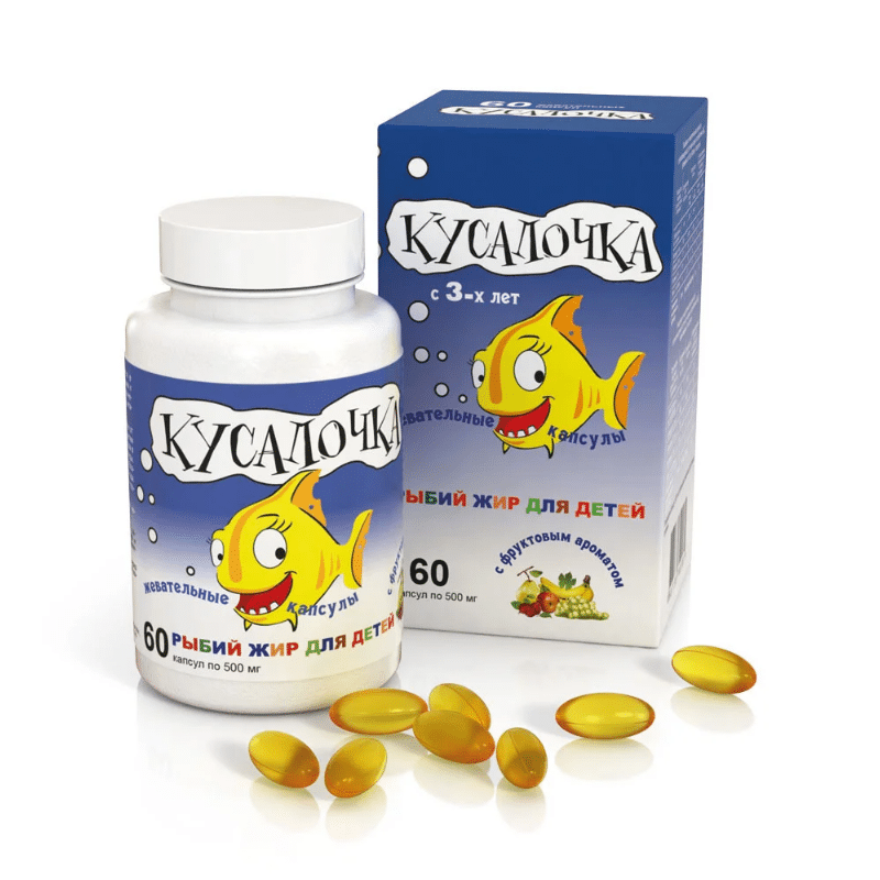 Кусалочка рыбий жир создан для маленьких исследователей, которым интересно всё вокруг. Чтобы узнать, что там внутри, капсулу КУСАЛОЧКИ можно раскусить. Ребёнок не получит негативных ощущений от контакта с содержимым. Для производства КУСАЛОЧКИ используется жир высокой степени очистки. В нём отсутствуют рыбные энзимы, обуславливающие характерный запах и вкус. Однако, если вдруг ребёнку не понравилось содержимое капсулы, в следующий раз её можно глотать, не раскусывая капсула растворится в желудке. Ребёнку от 3-х до 7-ми лет на курс приёма понадобится упаковка, содержащая 60 капсул, детям от 7-ми лет и взрослым подойдёт упаковка, содержащая 90 капсул.