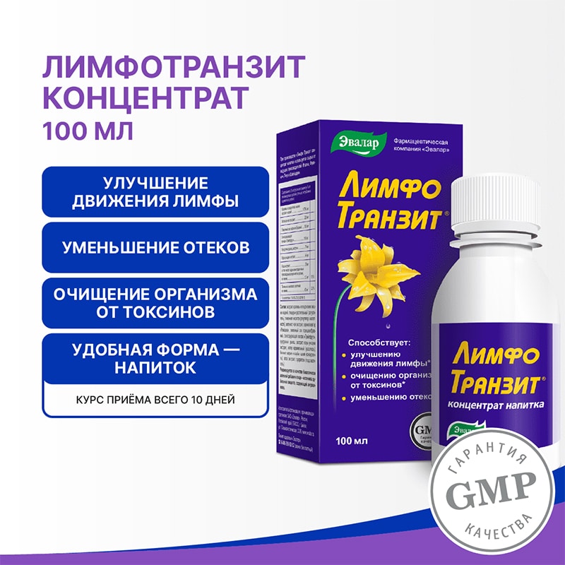 ЛимфоТранзит концентрированный напиток из экстрактов растений, разработанный специально для очищения лимфы. ЛимфоТранзит способствует: выведению жидкости из зоны отека, поддержанию здорового лимфотока, стимулируя выведение шлаков и токсинов, очищению организма. ЛимфоТранзит способствует улучшению движения лимфы, очищения организма от токсинов, снятию отеков. По мнению многих специалистов, очищение организма должно быть неотъемлемой процедурой, которая поможет сохранить здоровье и продлить годы активной жизни. Инновационный подход к очищению на сегодняшний день очищение с помощью специальных концентрированных напитков из экстрактов растений. Именно такая форма выпуска способствует более глубокому очищению. Очищение лимфы это немаловажная процедура, ведь лимфатическая система поддерживает чистоту внутренней среды организма. Её роль дренажно-детоксикационная. Именно она осуществляет транзит тканевой жидкости и выведение шлаков и токсинов из каждой клетки организма.