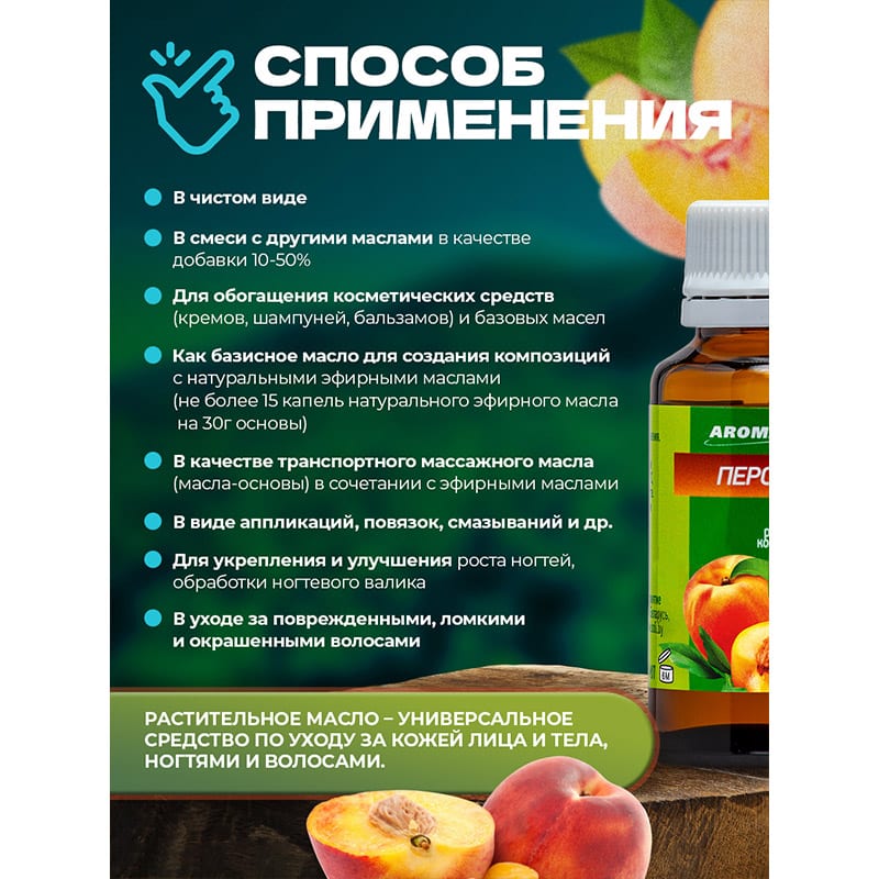 • Персиковое масло оказывает противовоспалительное, регенерирующее, увлажняющее, смягчающее, тонизирующее, осветляющее и омолаживающее для кожи действие.