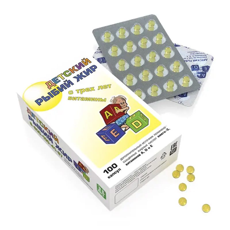 Рыбий жир, оболочка капсулы (желатин, глицерин, вода деминерализованная), смесь токоферолов (антиокислитель).