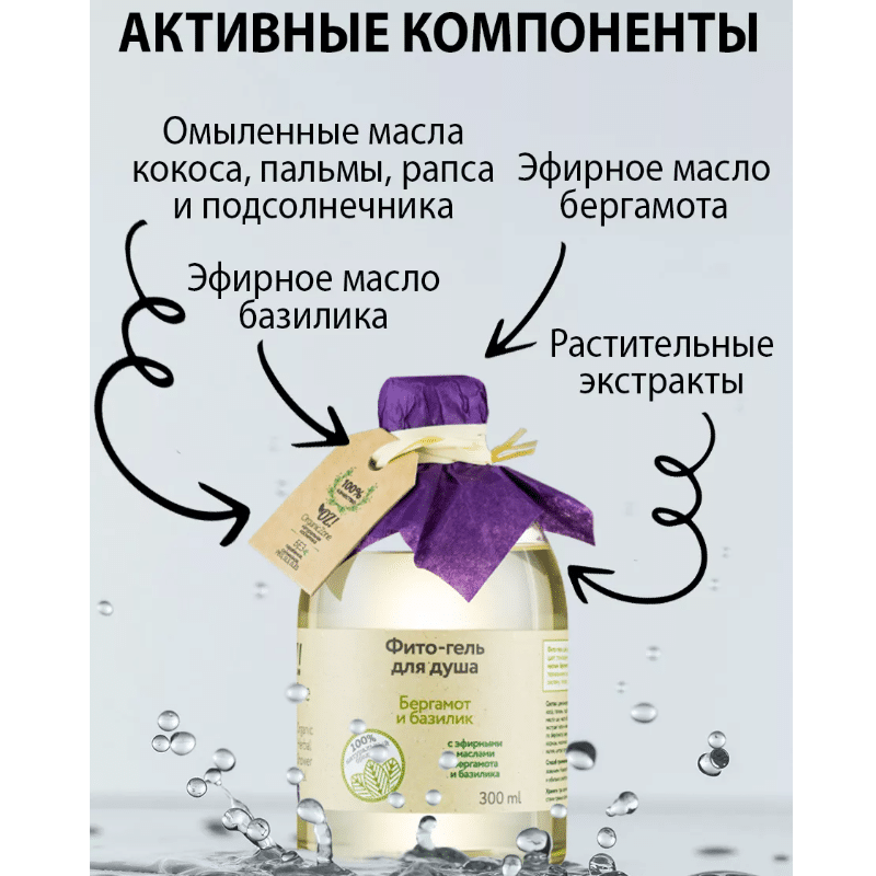 Фито-гель для душа «Бергамот и базилик» очищает, тонизирует и освежает. Благодаря эфирным маслам бергамота и базилика обладает антибактериальными свойствами, стимулирует иммунную систему, питает, разглаживает и обновляет кожу.