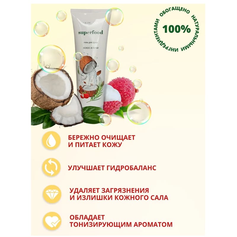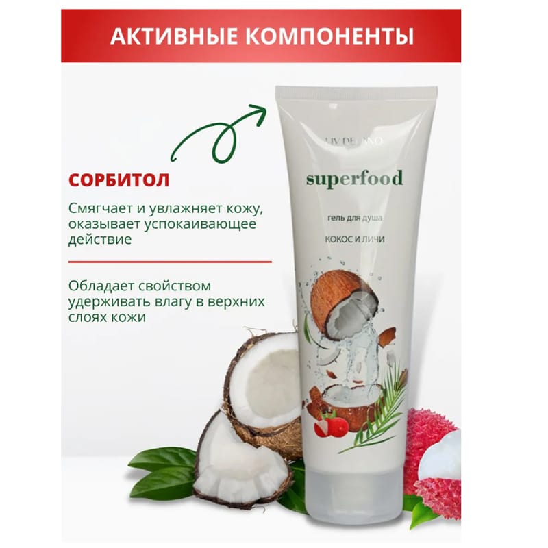 СодержитBeauPlex VH — уникальный витаминный комплекс состоящий из витаминов E, B3, B5, B6 и стабильной формы витамина C. Обладает восстанавливающими, увлажняющими, регенерирующими, питательными и антиоксидантными свойствами, помогает продлить молодость и здоровье кожи. Сорбитол смягчает и увлажняет кожу оказывает успокаивающее действие. Обладает свойством удерживать влагу верхних слоях кожи. Бархатный аромат кокоса и личи перенесёт вас на райский остров, накрывая волной истинного удовольствия.