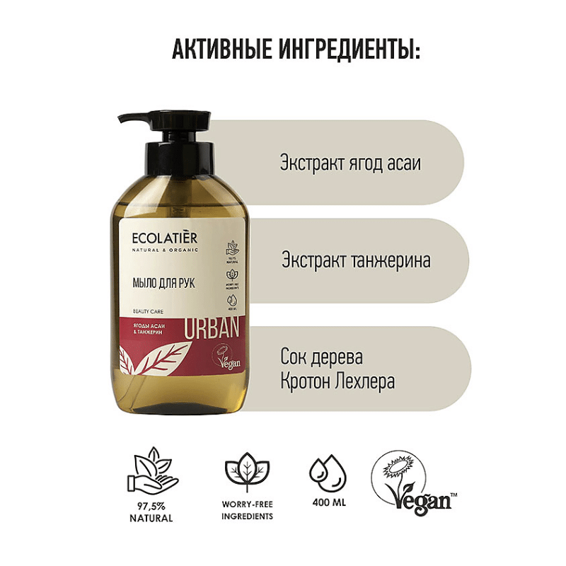 Жидкое мыло для рук ECOLATIER® URBAN с натуральными экстрактами и маслами в составе нежно очищает, смягчает и питает кожу рук, защищает от сухости.