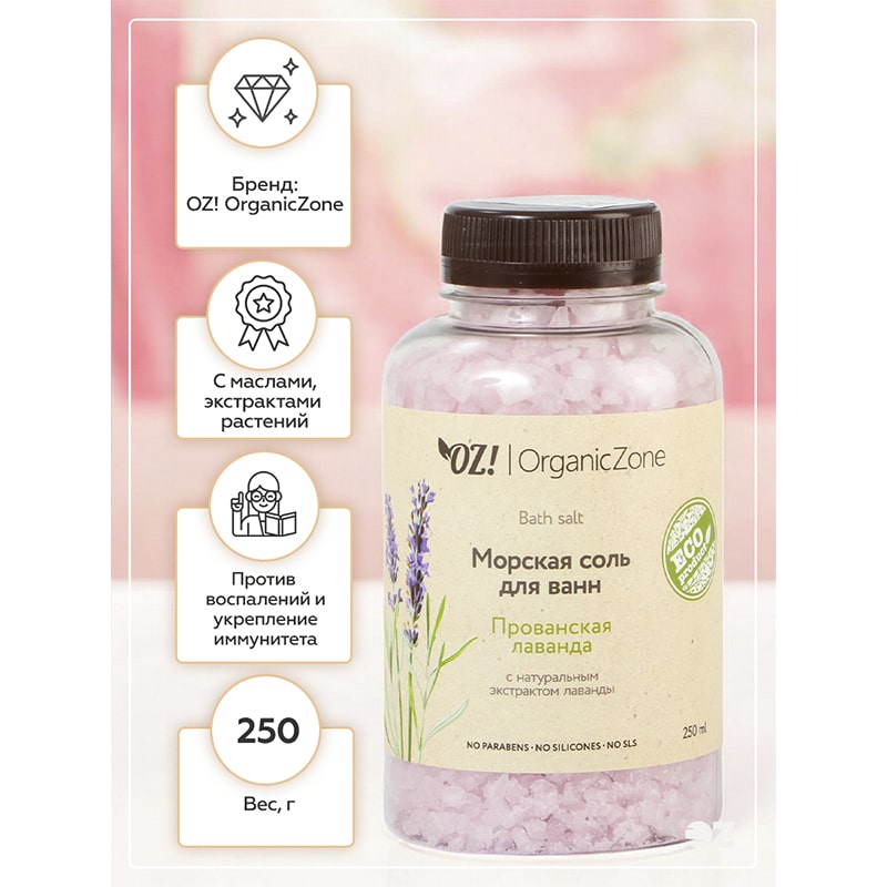 Натуральная морская соль в сочетании с экстрактом лаванды обладает успокаивающими, противовоспалительными, балансирующими и укрепляющими свойствами.