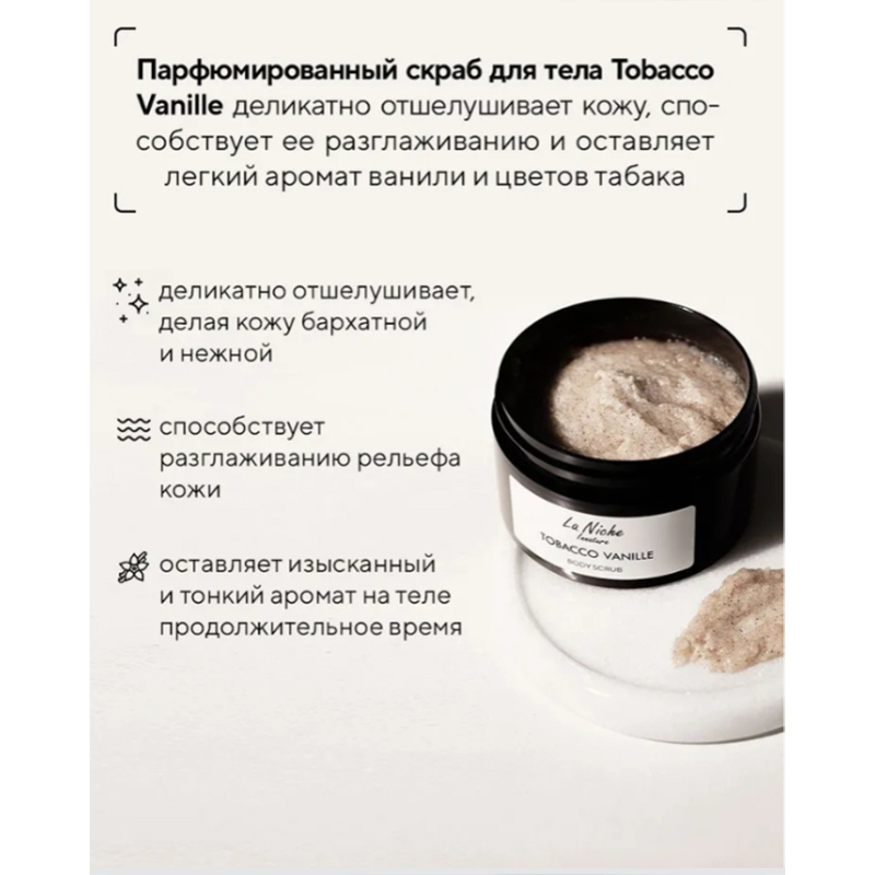 Натуральный парфюмированный скраб для тела «La Niche Tobacco Vanille» деликатно отшелушивает кожу, способствует ее разглаживанию, оставляя легкий аромат ванили и цветов табака. Аромат, пробуждающий трепетные чувства своей нежной, но при этом плотной композицией.