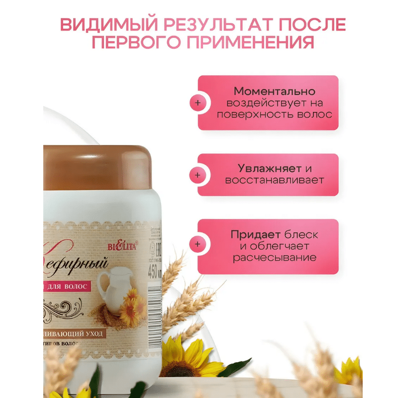 Легкий бальзам, обогащенный кефиром, моментально воздействует на поверхность волос: увлажняет их и восстанавливает, придает им блеск и облегчает расчесывание.