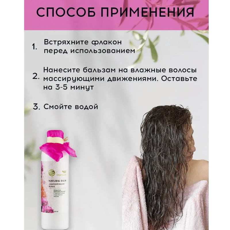 Способ применения: Встряхните флакон перед использованием. Нанесите бальзам на влажные волосы массирующими движениями, через 3-5 минут смойте водой.