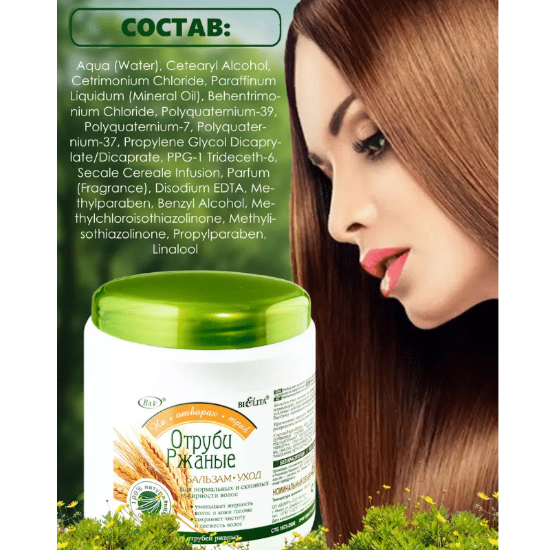 Бальзам-уход основан на отваре отрубей ржаных, которые активно нормализуют деятельность сальных желез кожи головы. Закрепляет и усиливает действие шампуня Отруби ржаные для нормальных и склонных к жирности волос: препятствует быстрому засаливанию волос, придавая им ухоженный вид.