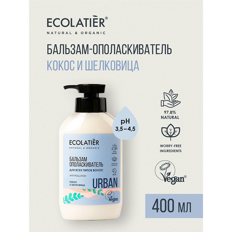 Бальзам для волос ECOLATIER® URBAN, благодаря входящим в состав натуральным ингредиентам, заботится о волосах, питает их. Придает волосам блеск и здоровый вид.