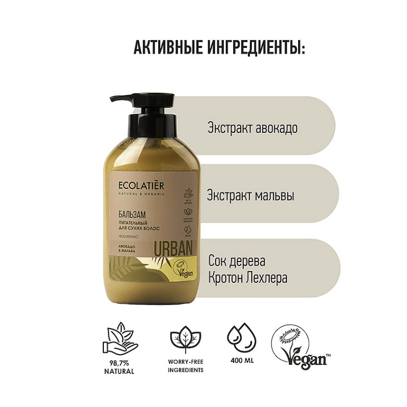Бальзам для волос ECOLATIER® URBAN, благодаря входящим в состав натуральным ингредиентам, заботится о волосах, питает их. Придает волосам блеск и здоровый вид.