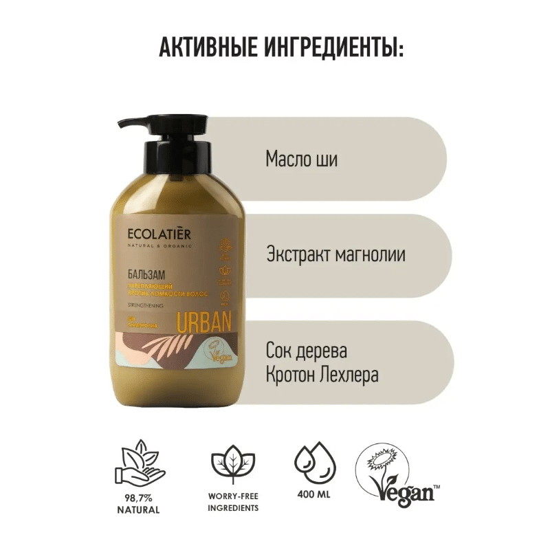 Бальзам для волос ECOLATIER® URBAN, благодаря входящим в состав натуральным ингредиентам, заботится о волосах, питает их. Придает волосам блеск и здоровый вид.