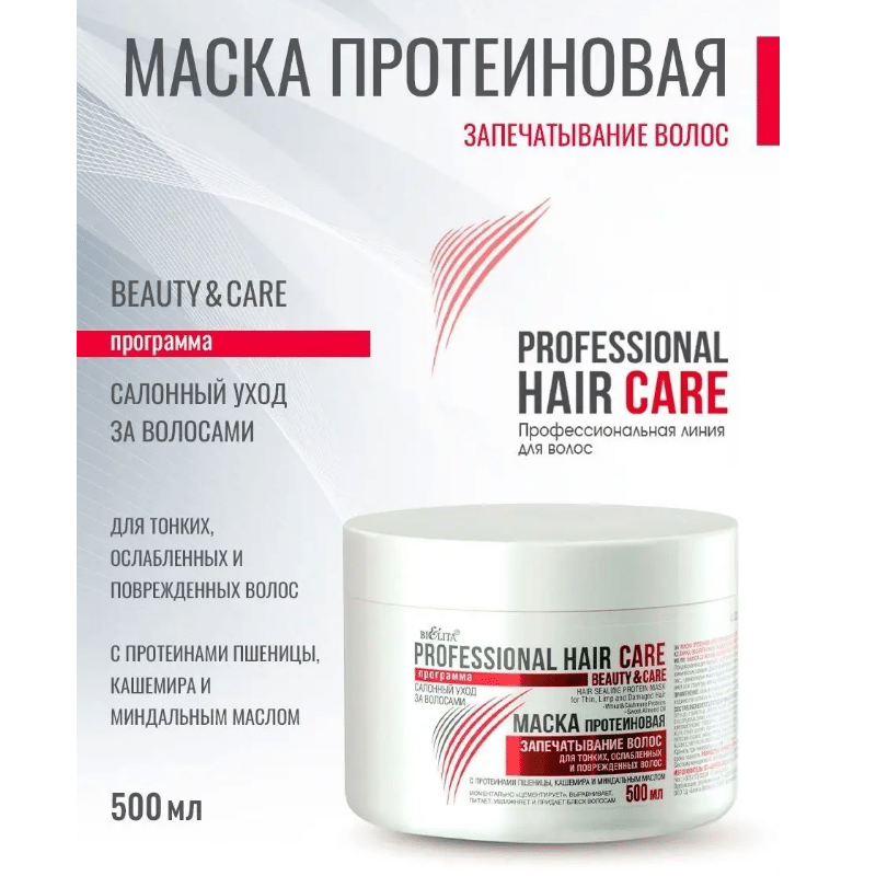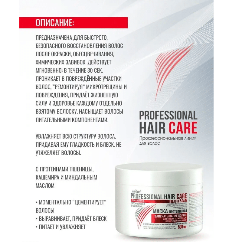 МАСКА ПРОТЕИНОВАЯ Запечатывание волос для тонких, ослабленных и поврежденных волос с протеинами пшеницы, кашемира и миндальным маслом Professional Hair Care