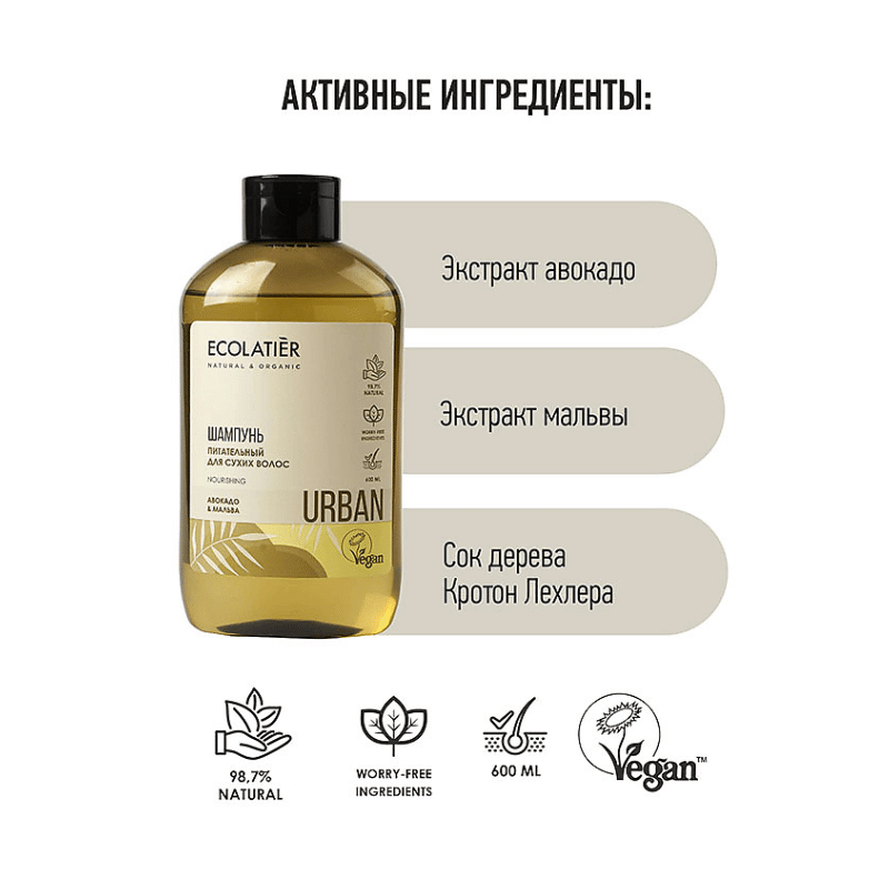 Шампунь ECOLATIER® URBAN, благодаря входящим в состав натуральным ингредиентам, заботится о волосах, укрепляет и питает их. Придает волосам ухоженный, здоровый вид.