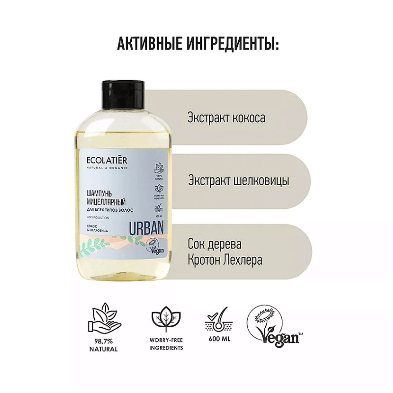 Шампунь ECOLATIER® URBAN, благодаря входящим в состав натуральным ингредиентам, заботится о волосах, укрепляет и питает их. Придает волосам ухоженный, здоровый вид.