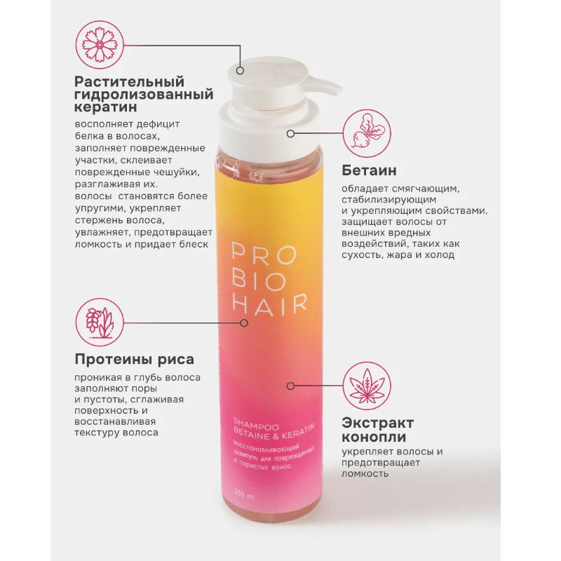 Аqua (вода), cocamidopropyl betaine (растительное пав), coco-glucoside (мягкое пав), sodium cocoyl isethionate (растительное пав), hydrolyzed keratin (кератин), hydrolyzed wheat protein (протеины пшеницы), lactic acid (молочная кислота), benzyl alcohol (бензиловый спирт), betaine (бетаин), guar hydroxypropyltrimonium chloride (кондиционирующий агент), hydrolyzed rice protein (протеины риса), hydrolyzed hemp seed extract (экстракт конопли), prunus аmygdalus dulcis oil (масло миндальное), sodium benzoate (натрия бензоат), postassium sorbate (калия сорбат), citric acid (лимонная кислота), parfum (парфюмерная композиция), hydrogenated starch hydrolysate (сорбитол), ci 14720, ci 42090.
