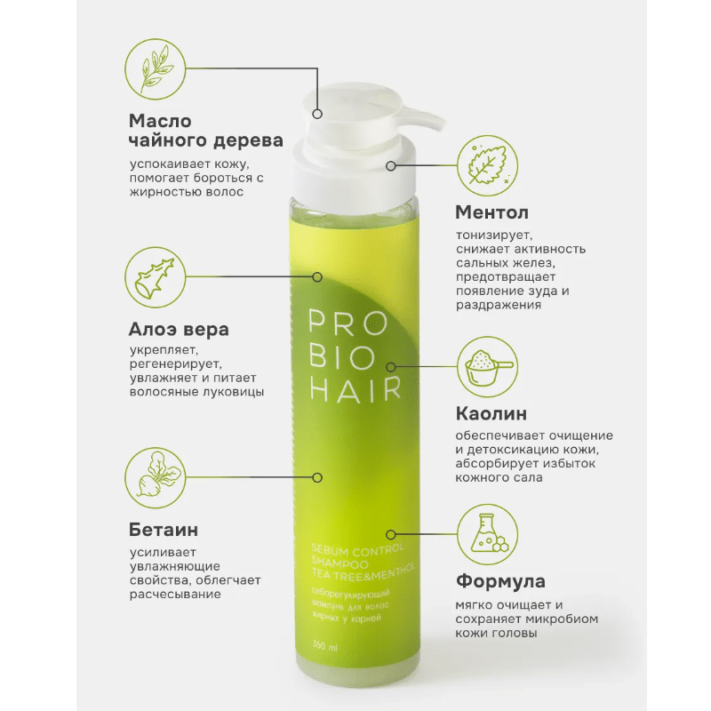Масло чайного дерева оказывает себорегулирующий и антибактериальный эффект, успокаивает кожу, помогает бороться с жирностью волос. Ментол надолго оставляет ощущение свежести и чистоты.
