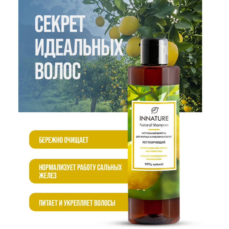 Шампунь для волос Регулирующий для жирных и проблемных волос Innature
