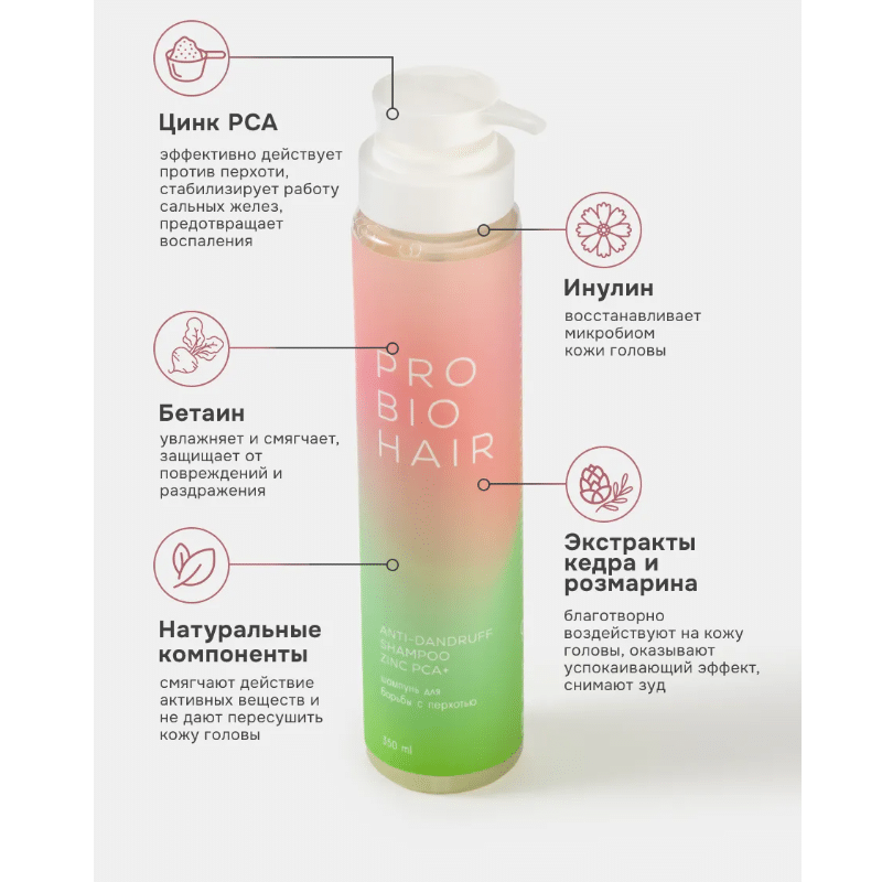 Формула, насыщенная инулином, восстанавливает микробиом кожи головы. Экстракты кедра и розмарина благотворно действуют на кожу головы, оказывают успокаивающий эффект, снимают зуд.