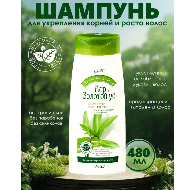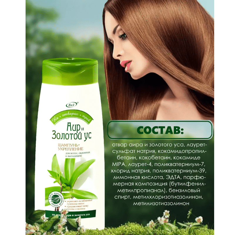 Шампунь-укрепление содержит полезный отвар аира и золотого уса. Активно укрепляет корни волос и способствует их росту. Придает волосам силу и природный блеск.