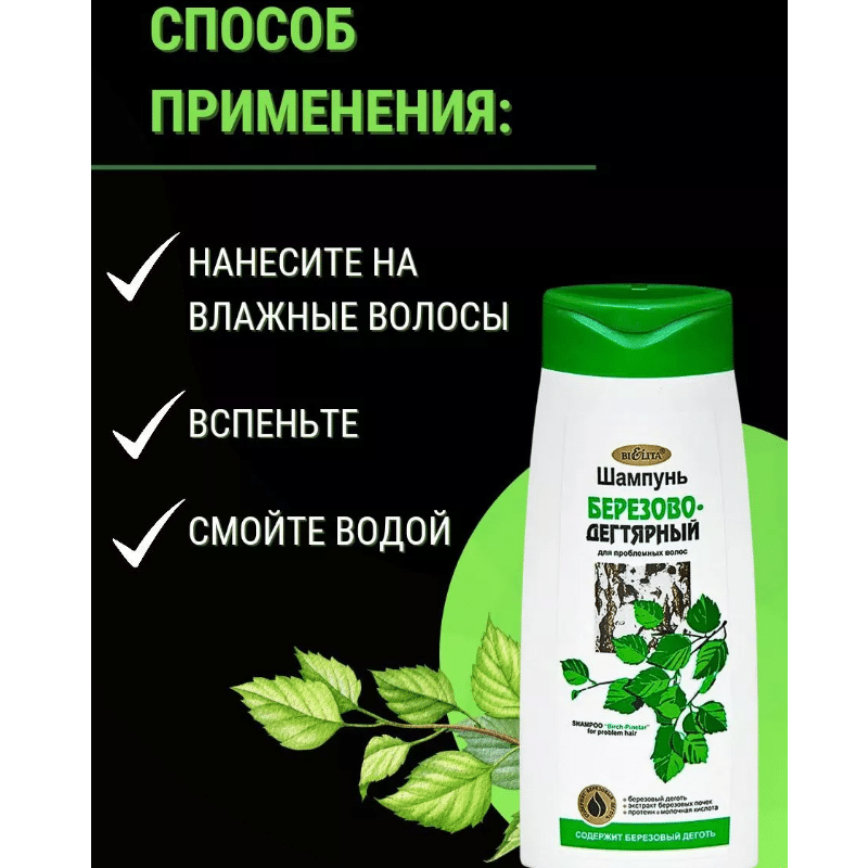 Природный лечебный компонент деготь оказывает дезинфицирующее и терапевтическое действие. Экстракт березовых почек, молочная кислота и натуральный протеин улучшают кровообращение кожи головы, стимулируют регенерацию эпидермиса.