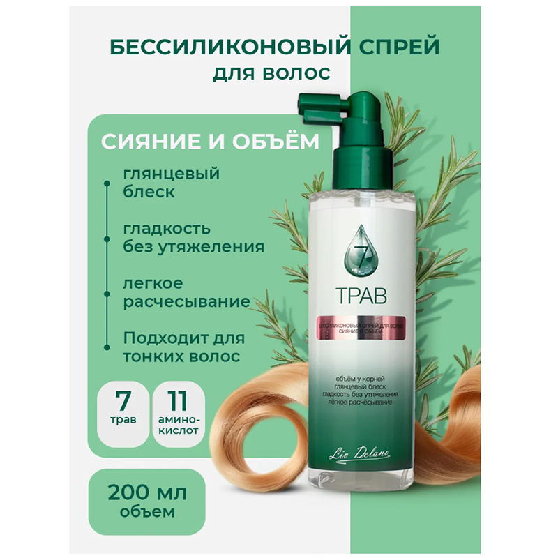 Бессиликоновый спрей для волос Сияние и объём 7 Трав