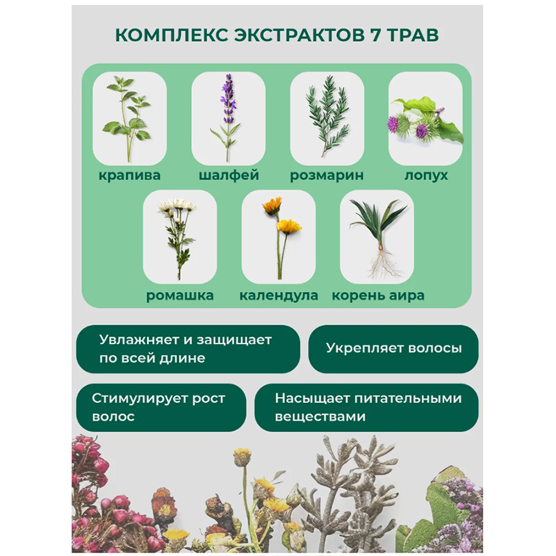КОМПЛЕКС ЭКСТРАКТОВ (крапивы, шалфея, розмарина, ромашки, календулы, лопуха, корня аира):