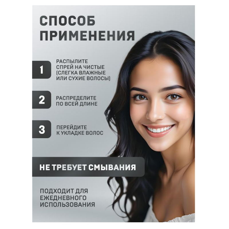 Применение: Энергично встряхните флакон для перемешивания фаз. Равномерно распылить спрей на влажные или подсушенные волосы с расстояния 15-20 см. Не требует смывания.